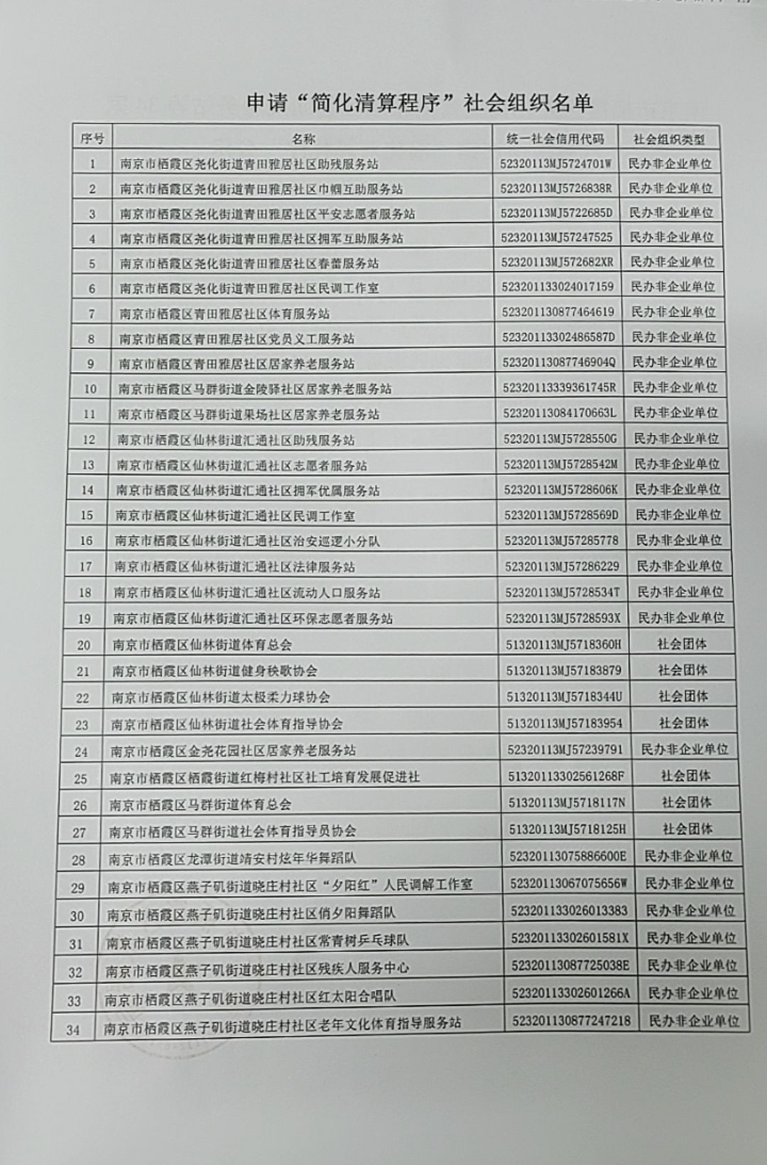 信息名稱:    南京市棲霞區堯化街道青田雅居社區助殘服務站等34家社會組織注銷“簡化清算程序”公示