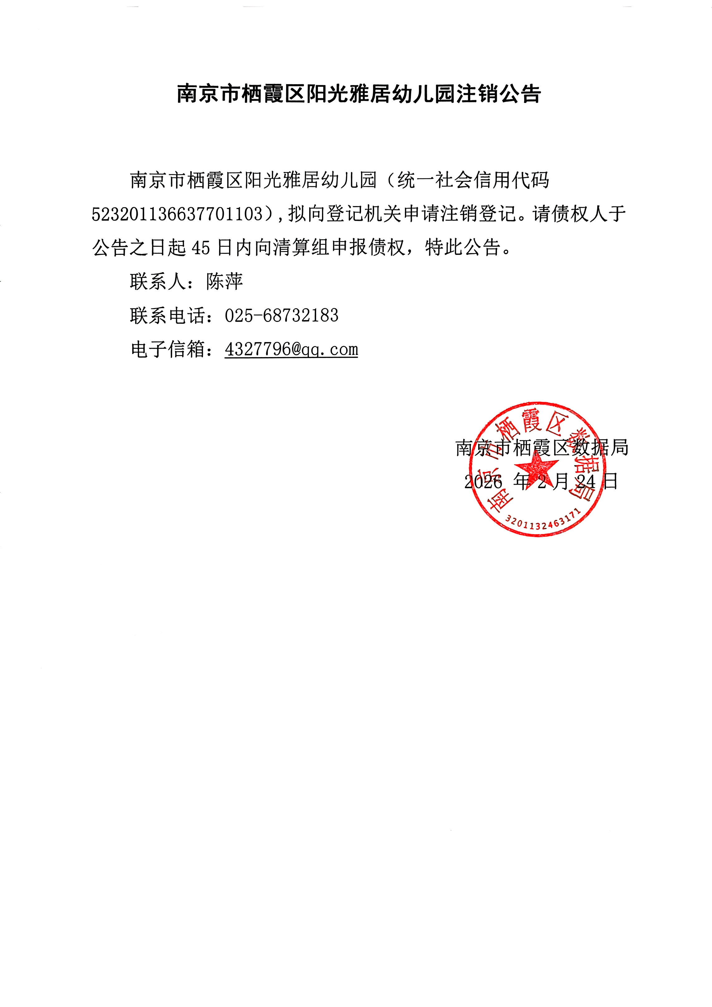 南京市棲霞區陽光雅居幼兒園注銷公告