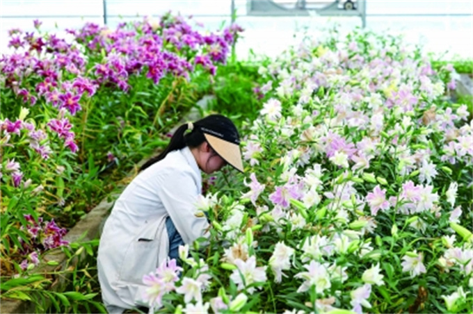 618,南京農業大學八卦洲百合研究基地內,南農大百合科研團隊工作人員在進行科研工作。眼下,基地百合花盛開,吸引不少市民前來觀賞。