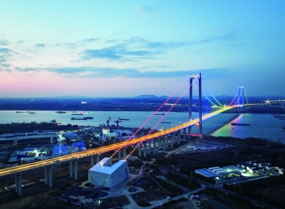 1218日傍晚,龍潭長江大橋正在進行亮化試燈。目前,龍潭長江大橋正有序推進附屬結構工程施工,預計今年年底基本建成。大橋通車后,從南京龍潭最快6分鐘可到揚州儀征、半小時可達揚州主城區,對推動寧鎮揚一體化發展、優化過江通道布局、完善高速公路網絡等具有重要意義。
