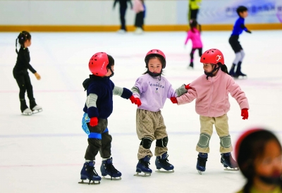 近日,小朋友們在棲霞區城北萬象匯滑冰場體驗滑冰運動帶來的樂趣。今年冬天,南京冰雪消費持續升溫,冰雪+”經濟活力顯現。