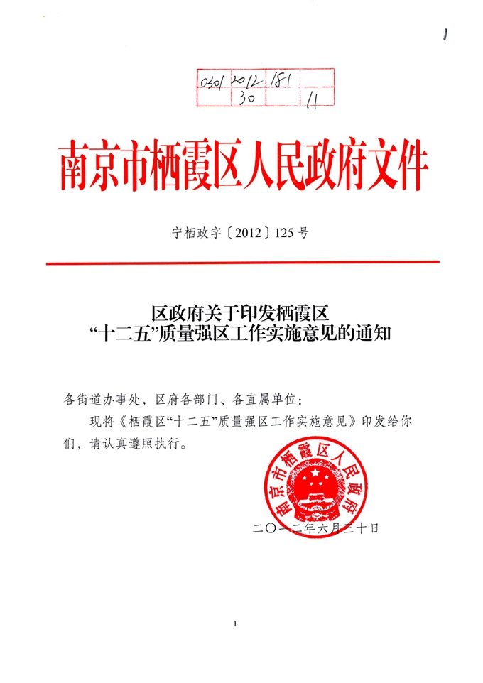 區(qū)政府關于印發(fā)棲霞區(qū)“十二五”質量強區(qū)工作實施意見的通知