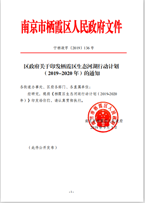 區政府關于印發《棲霞區生態河湖行動計劃(2019-2020 年)》的通知