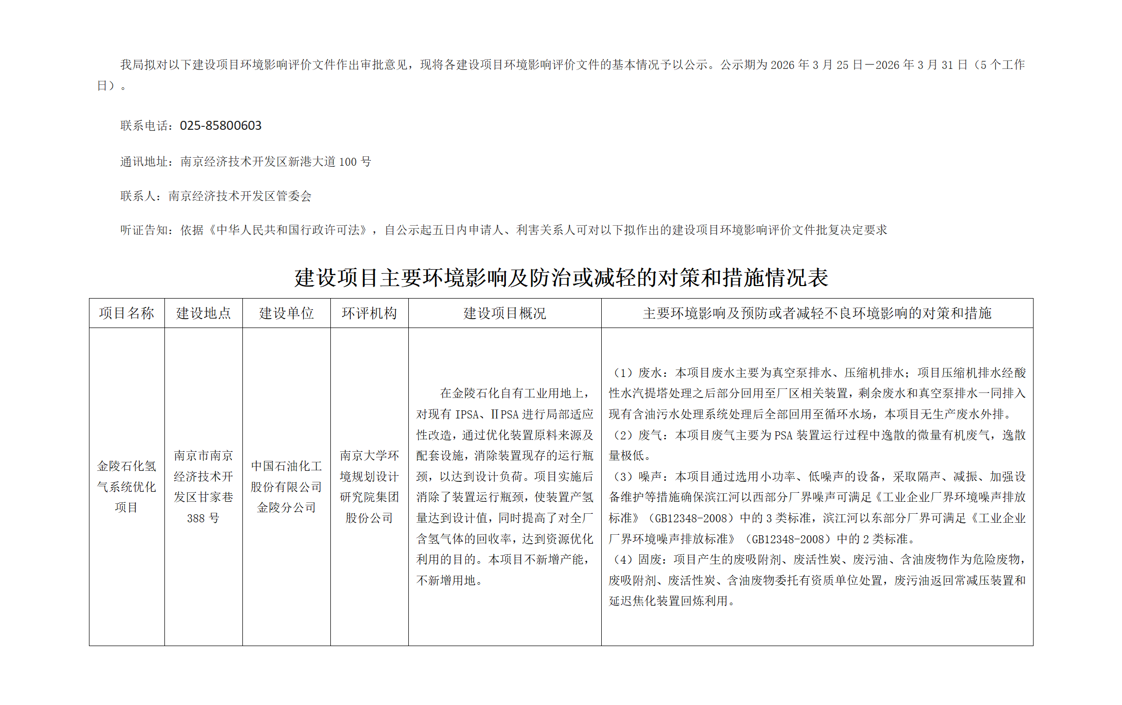 建設項目主要環境影響及防治或減輕的對策和措施情況表(金陵石化氫氣系統優化項目)