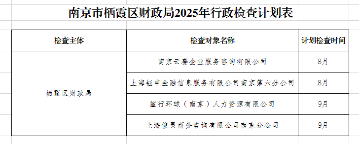 南京市棲霞區財政局2025年行政檢查計劃表