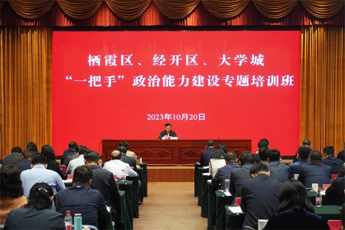 10月20日至21日,2023年度棲霞區、南京經開區、仙林大學城“一把手”政治能力建設專題培訓班舉行,深入學習貫徹黨的二十大精神和習近平總書記對江蘇工作重要講話精神,重點提升“一把手”的政治能力,引領帶動廣大黨員干部牢記囑托、感恩奮進,進一步匯聚團結奮斗、攻堅克難的正能量,不斷開創高質量發展新局面。棲霞區委書記、南京經濟技術開發區黨工委書記、仙林大學城黨工委書記戴華杰作開班動員講話。