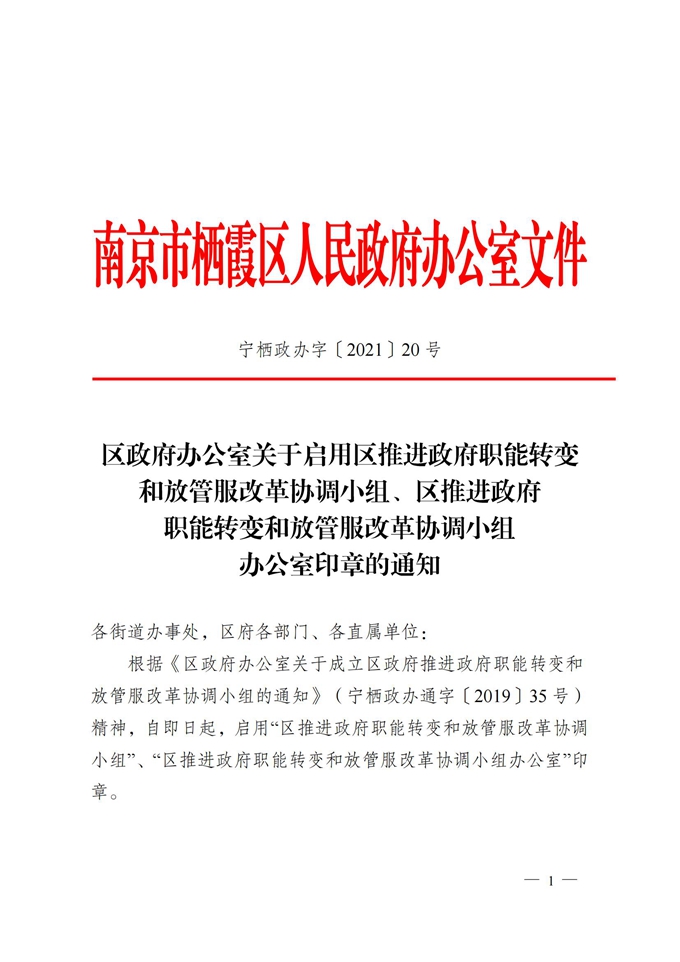 區政府辦公室關于啟用區推進政府職能轉變和“放管服”改革協調小組、區推進政府職能轉變和“放管服”改革協調小組辦公室印章發通知