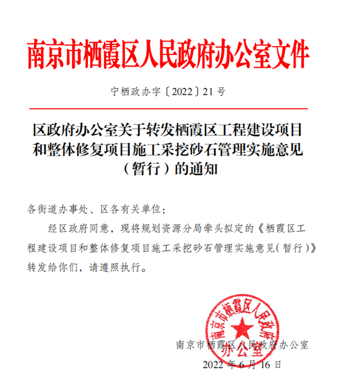 寧棲政辦字〔2022〕21號 區政府辦公室關于轉發棲霞區工程建設項目和整體修復項目施工采挖砂石管理實施意見(暫行)的通知