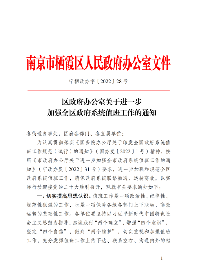 寧棲政辦字〔2022〕28號 區政府辦公室關于進一步加強全區政府系統值班工作的通知