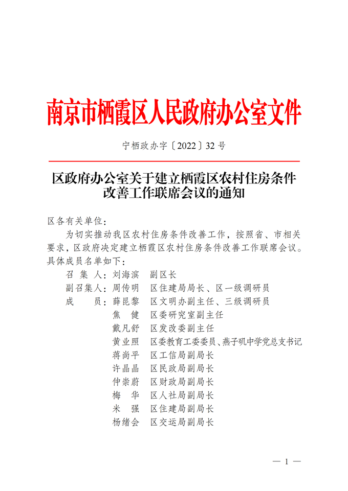寧棲政辦字〔2022〕32號 區政府辦公室關于建立棲霞區農村住房條件改善工作聯席會議的通知