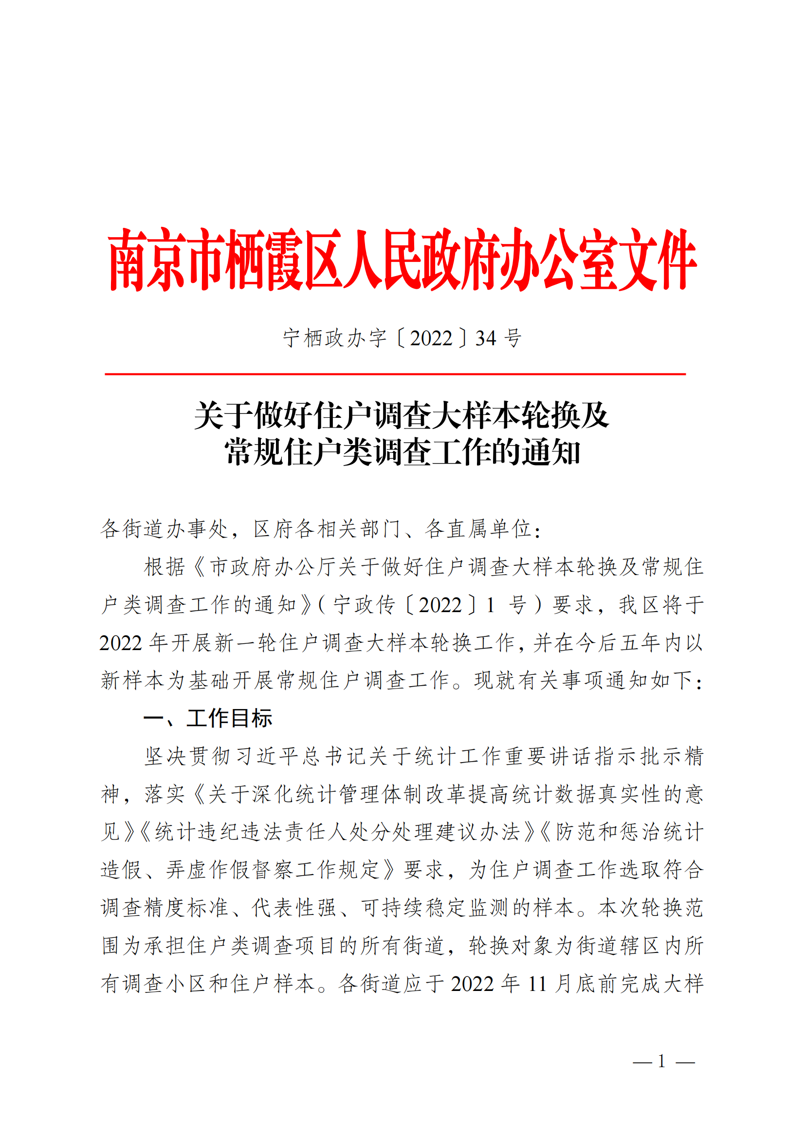 寧棲政辦字〔2022〕34號 關于做好住戶調查大樣本輪換及常規住戶類調查工作的通知