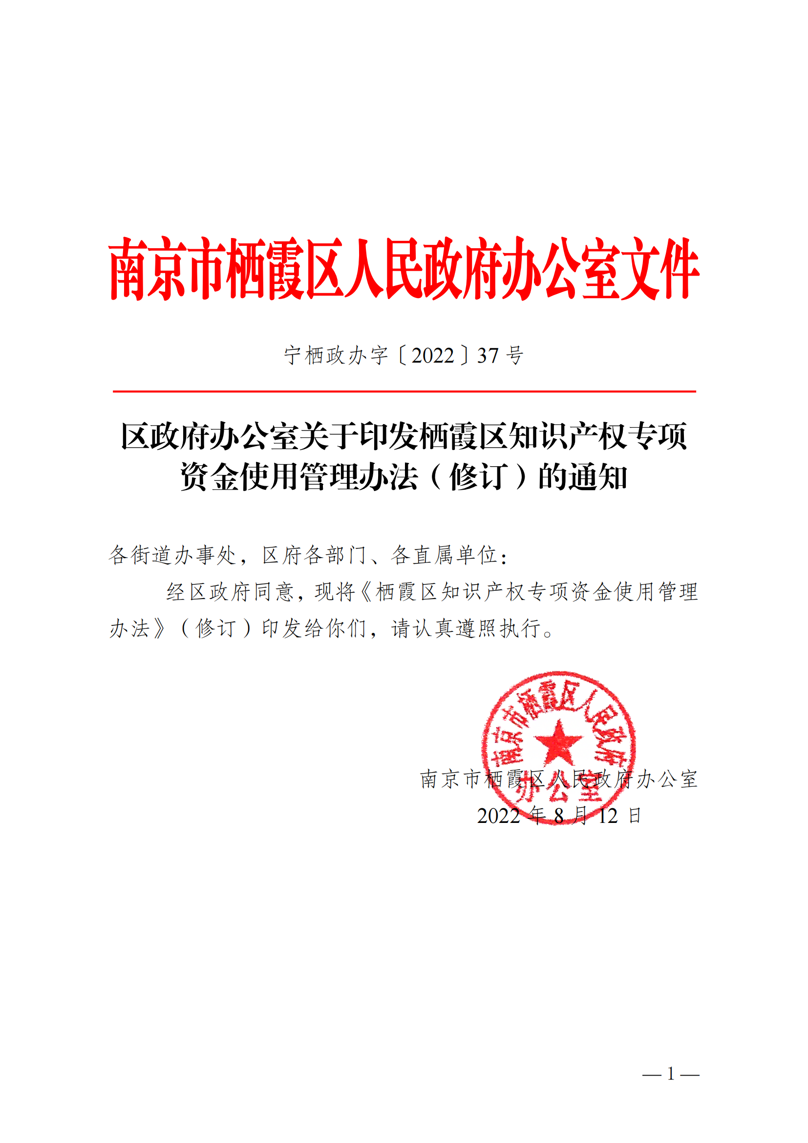 寧棲政辦字〔2022〕37號 關于印發《棲霞區知識產權專項資金使用管理辦法》的通知