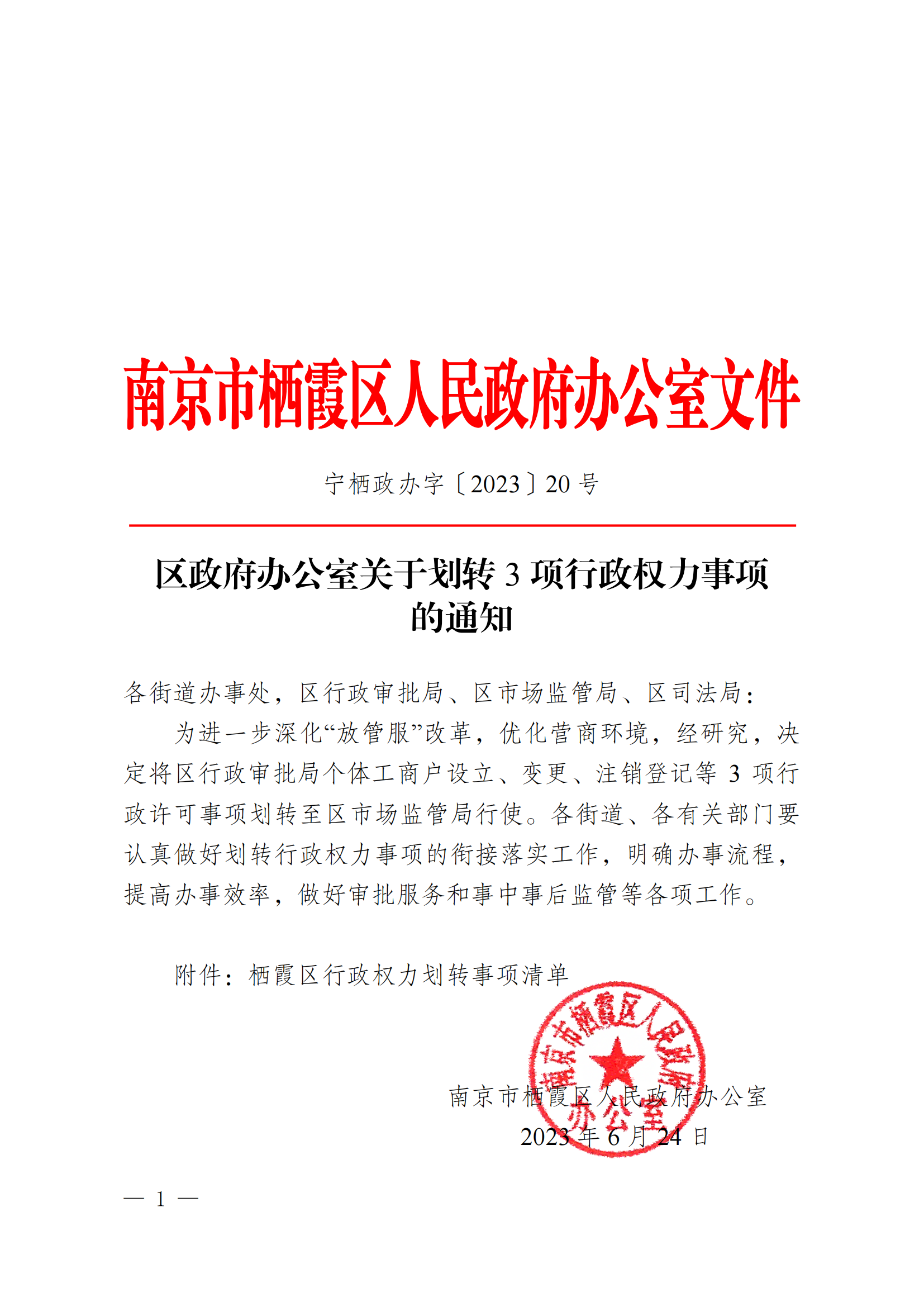寧棲政辦字〔2023〕20號 區(qū)政府辦公室關(guān)于劃轉(zhuǎn)3項行政權(quán)力事項的通知