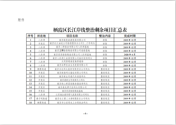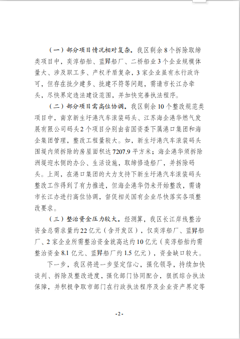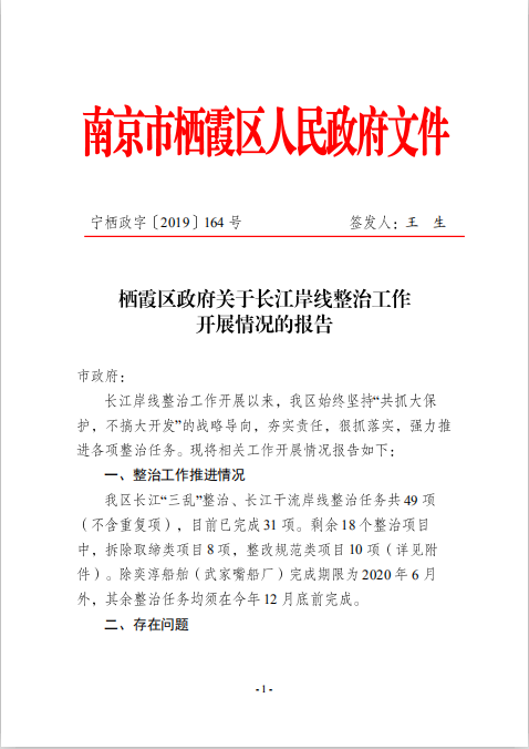 棲霞區政府關于長江岸線整治工作開展情況的報告
