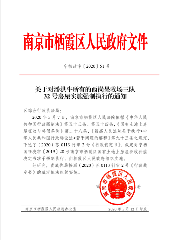 對潘洪牛所有的西崗果牧場三隊32號房屋實施強制執行的通知