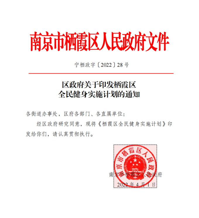 區政府關于印發棲霞區全民健身實施計劃的通知