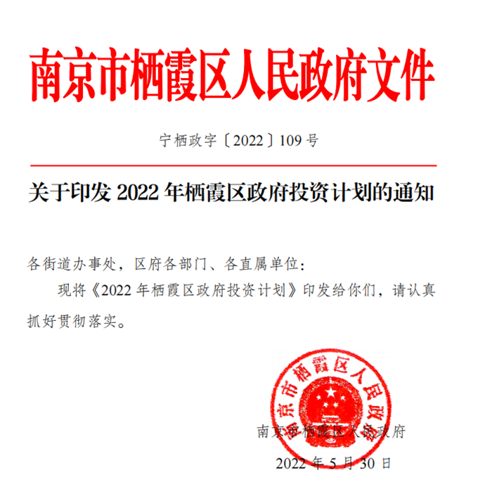 寧棲政字〔2022〕109號 關于印發2022年棲霞區政府投資計劃的通知