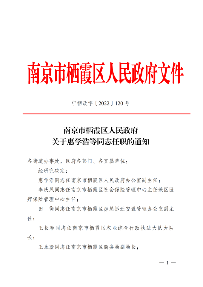 寧棲政字〔2022〕120 號 南京市棲霞區人民政府關于惠學浩等同志任職的通知