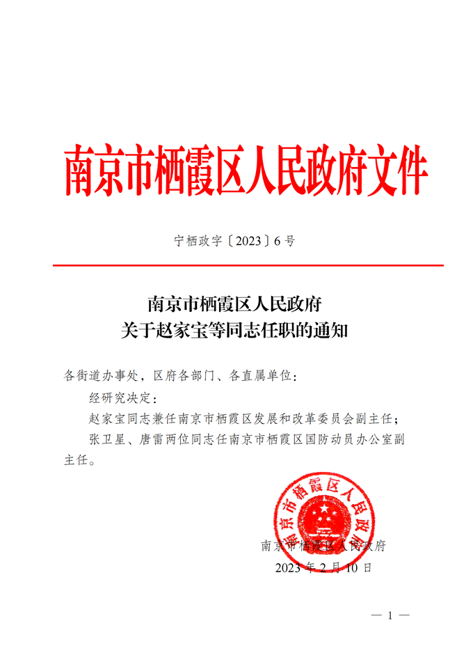 南京市棲霞區人民政府關于趙家寶等同志任職的通知