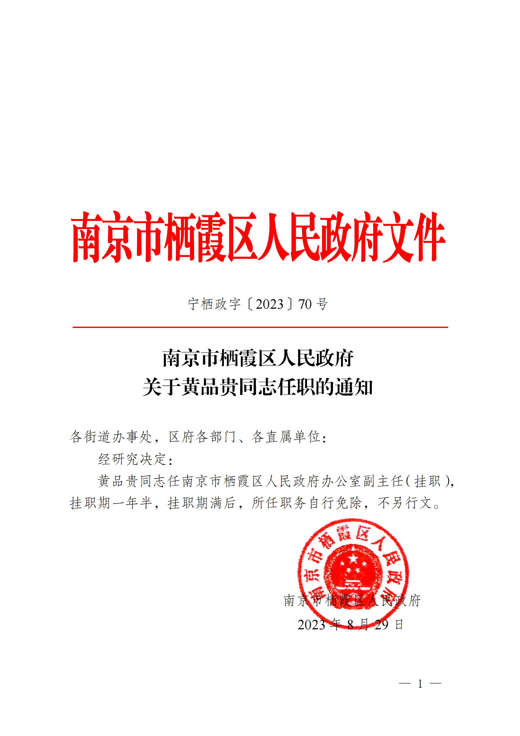 寧棲政字〔2023〕70號 南京市棲霞區(qū)人民政府關(guān)于黃品貴同志任職的通知