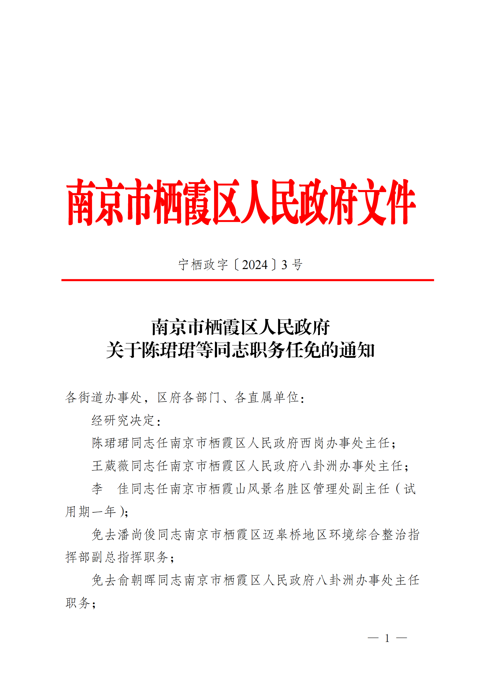 南京市棲霞區(qū)人民政府關(guān)于陳珺珺等同志職務(wù)任免的通知