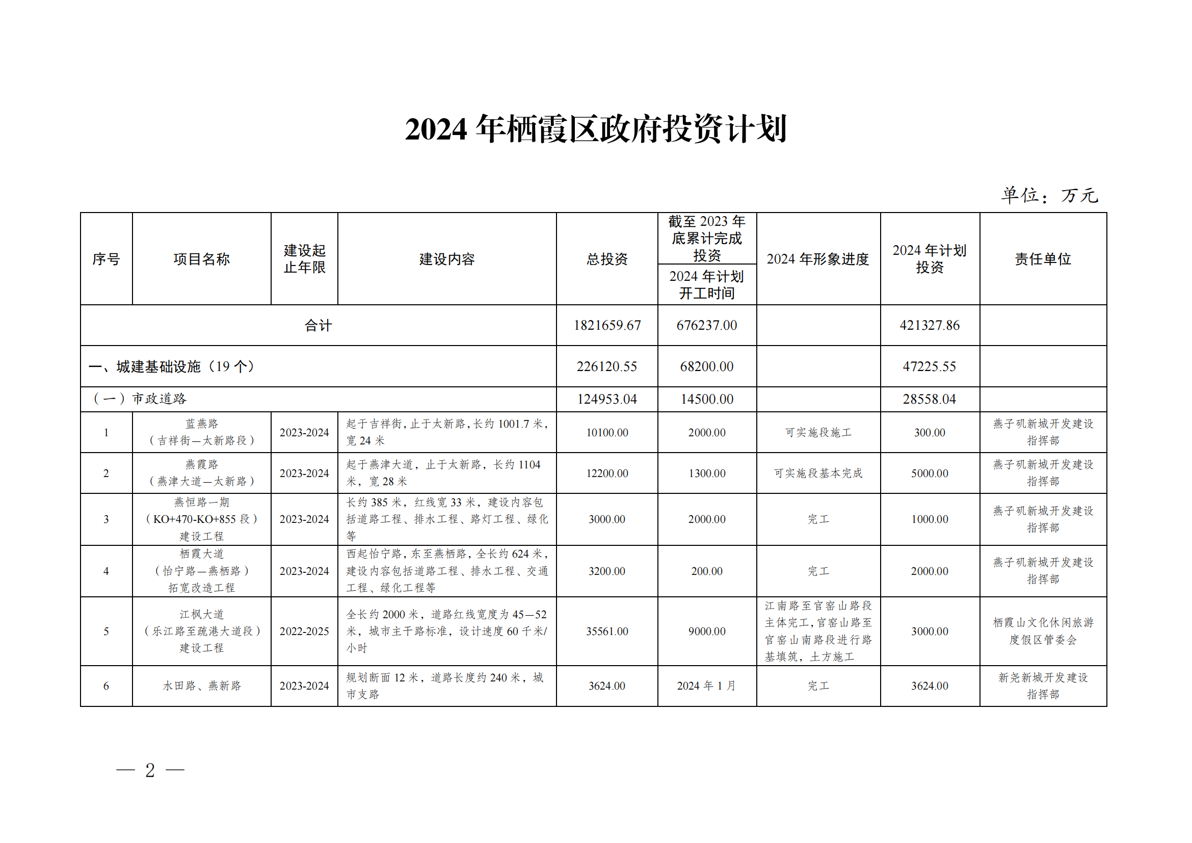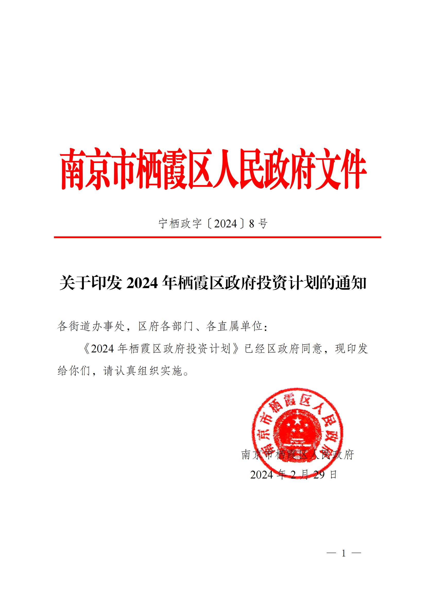 寧棲政字〔2024〕8號 關于印發2024年棲霞區政府投資計劃的通知