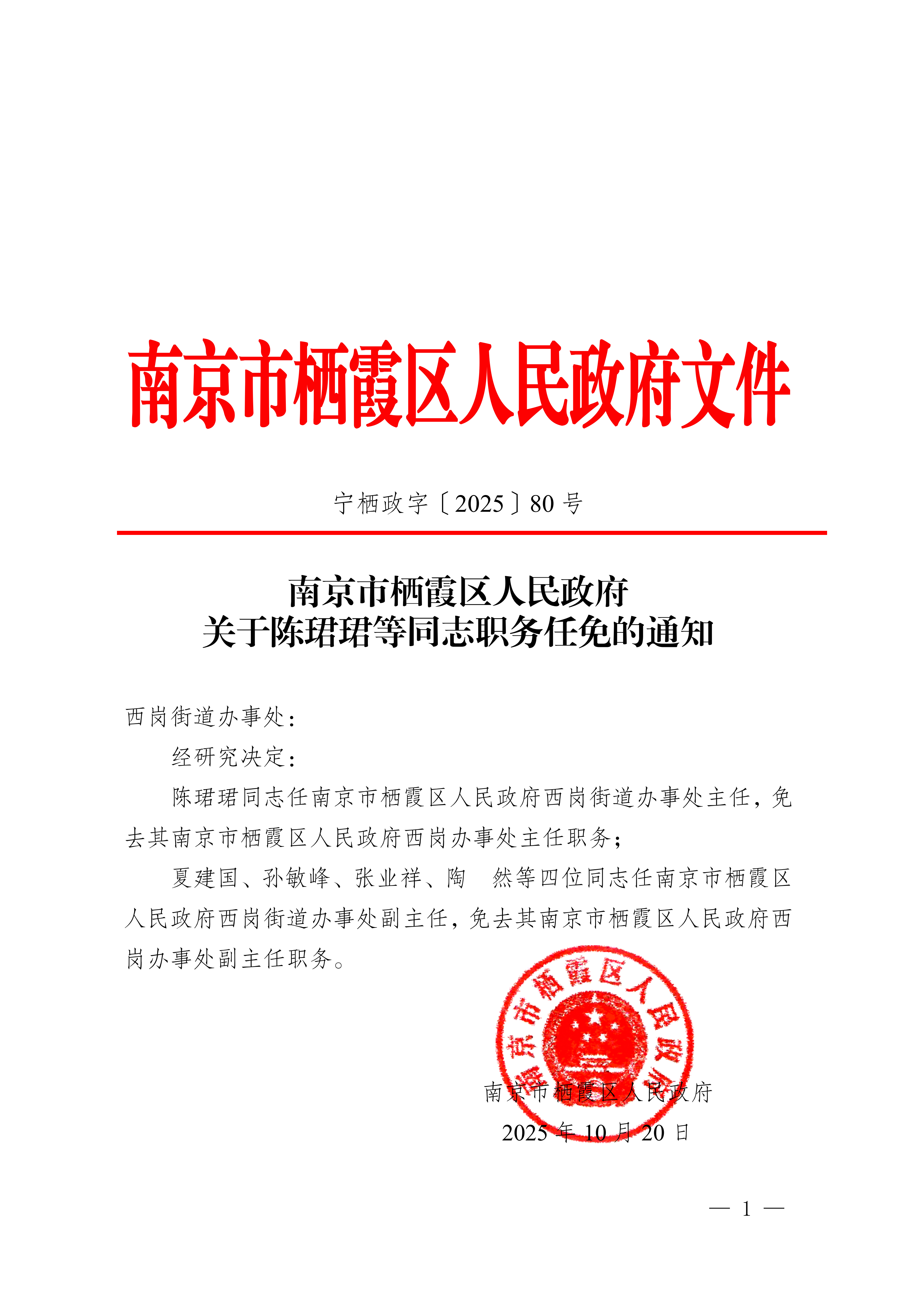 寧棲政字〔2025〕80號(hào) 南京市棲霞區(qū)人民政府關(guān)于陳珺珺等同志職務(wù)任免的通知