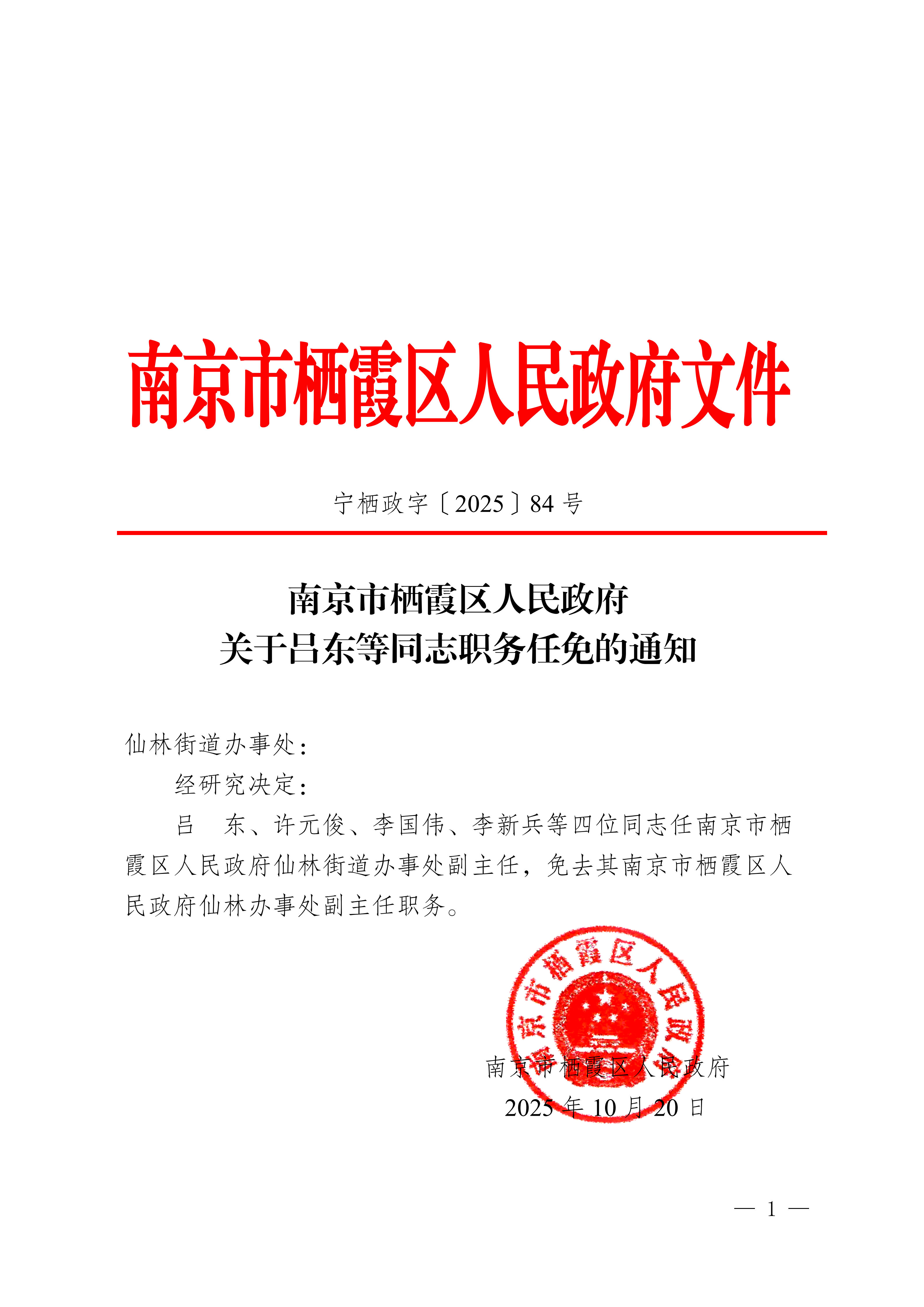 寧棲政字〔2025〕84號 南京市棲霞區人民政府關于呂東等同志職務任免的通知