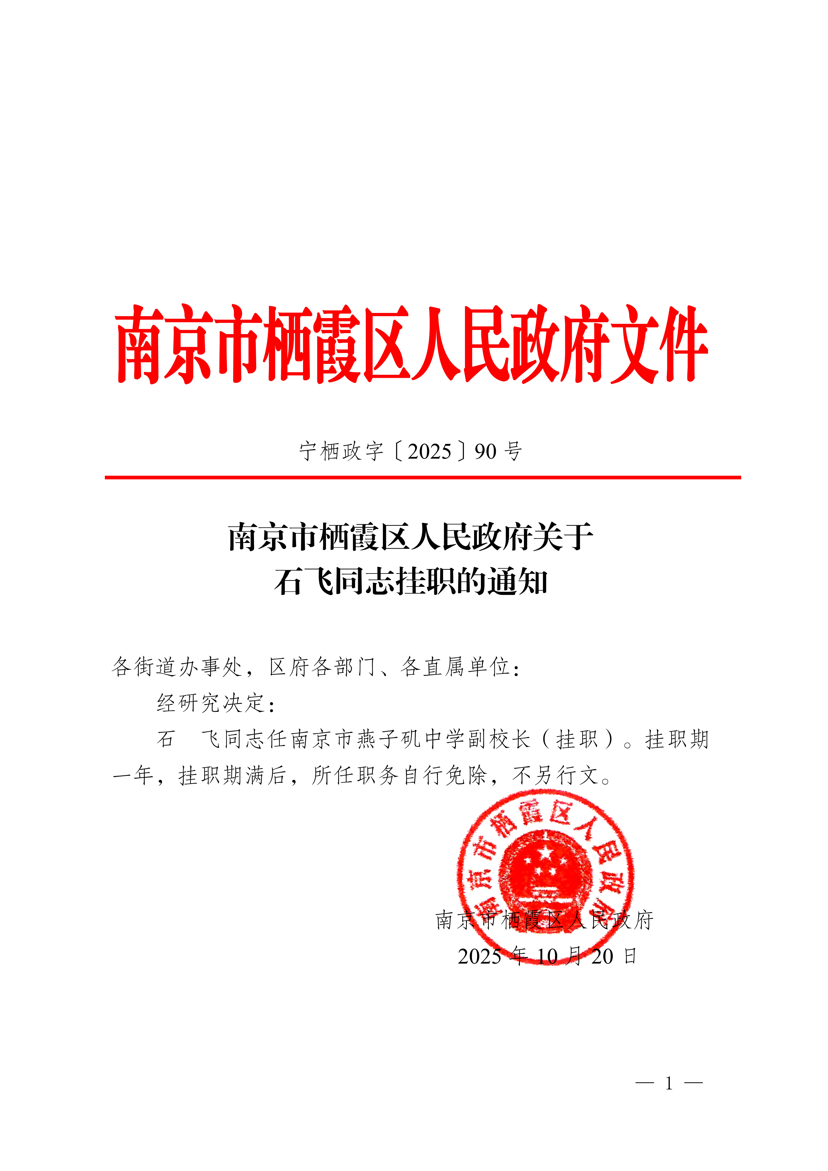 寧棲政字〔2025〕90號(hào) 南京市棲霞區(qū)人民政府關(guān)于石飛同志掛職的通知
