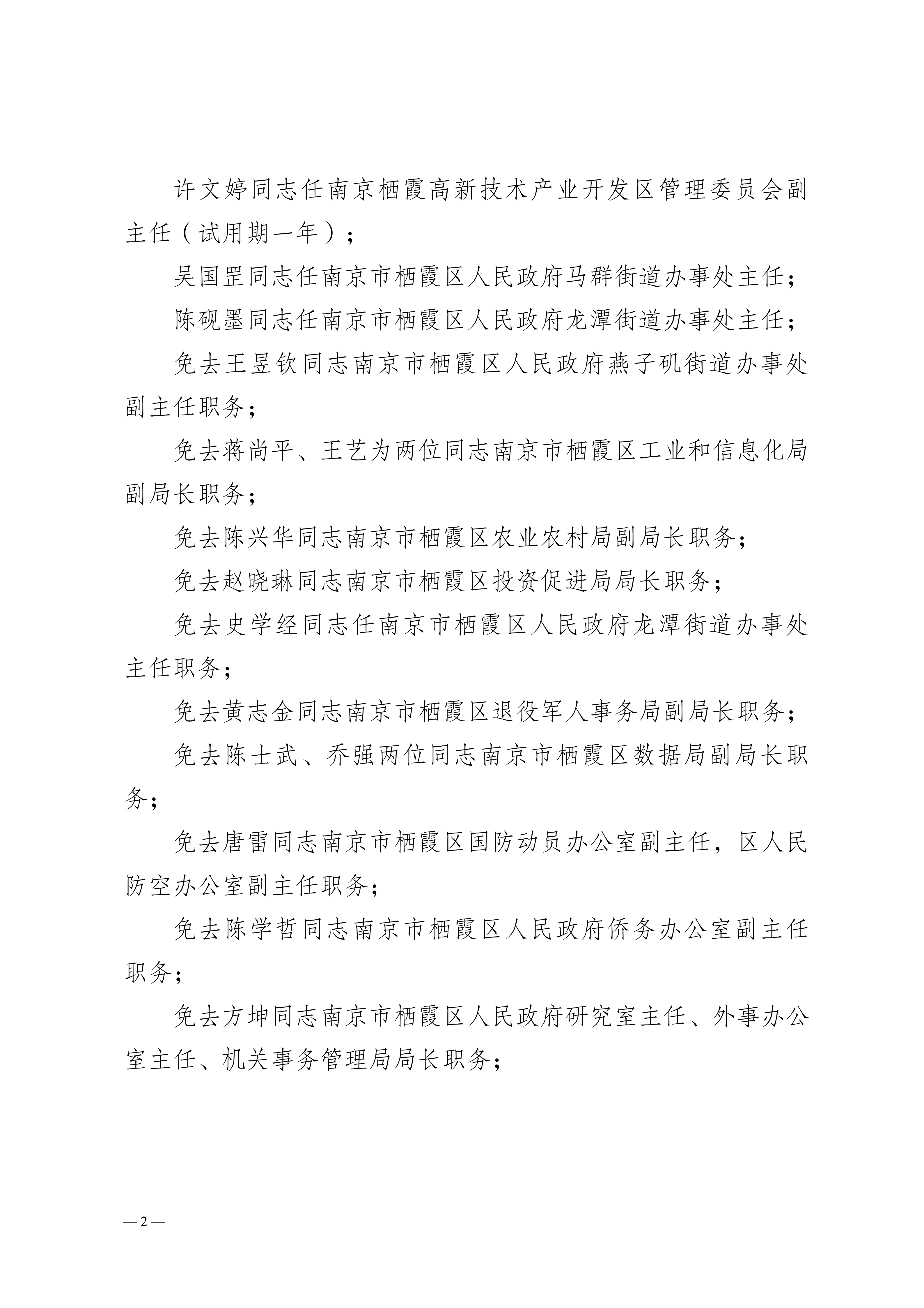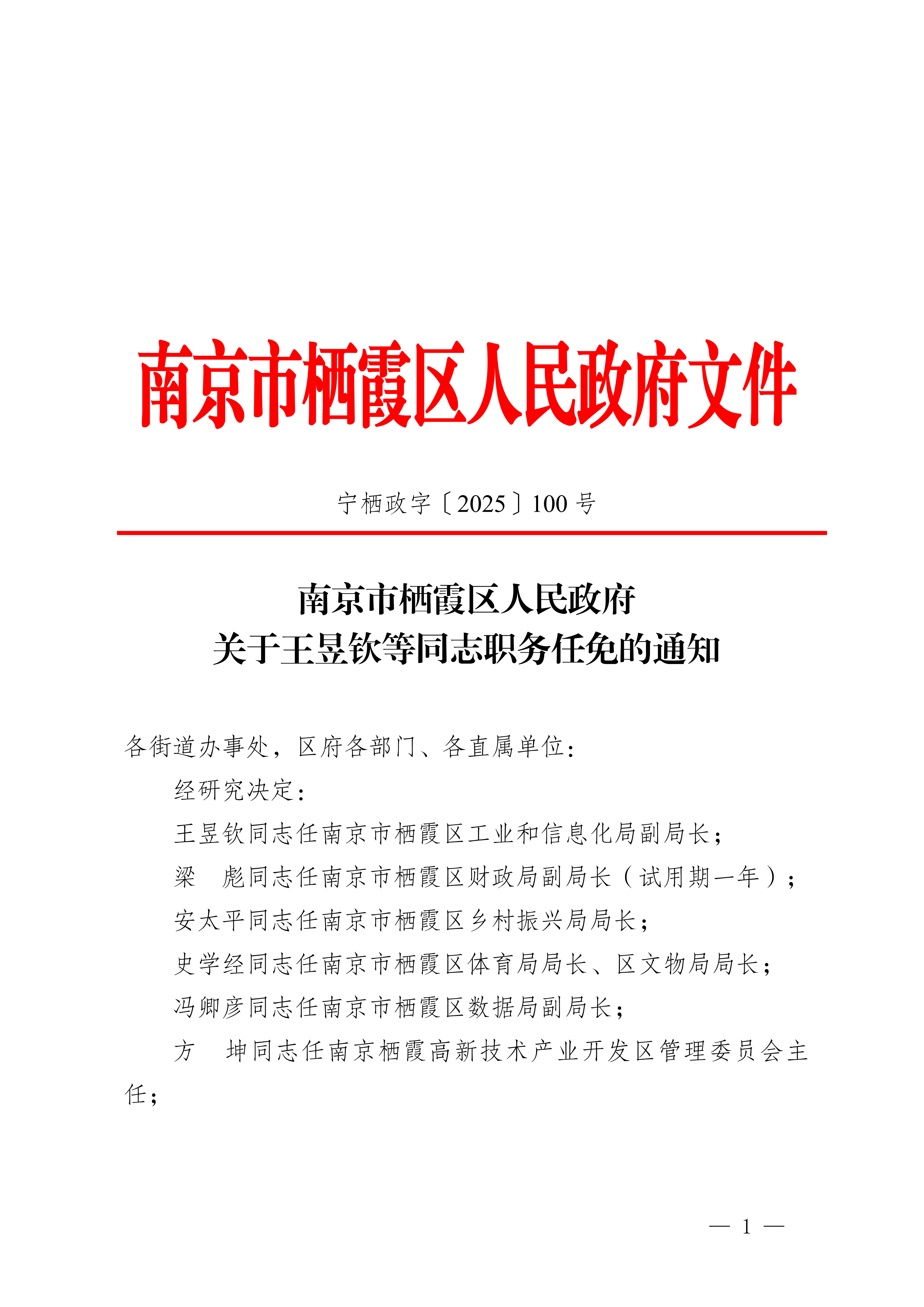 寧棲政字〔2025〕100號 南京市棲霞區人民政府關于王昱欽等同志任免的通知