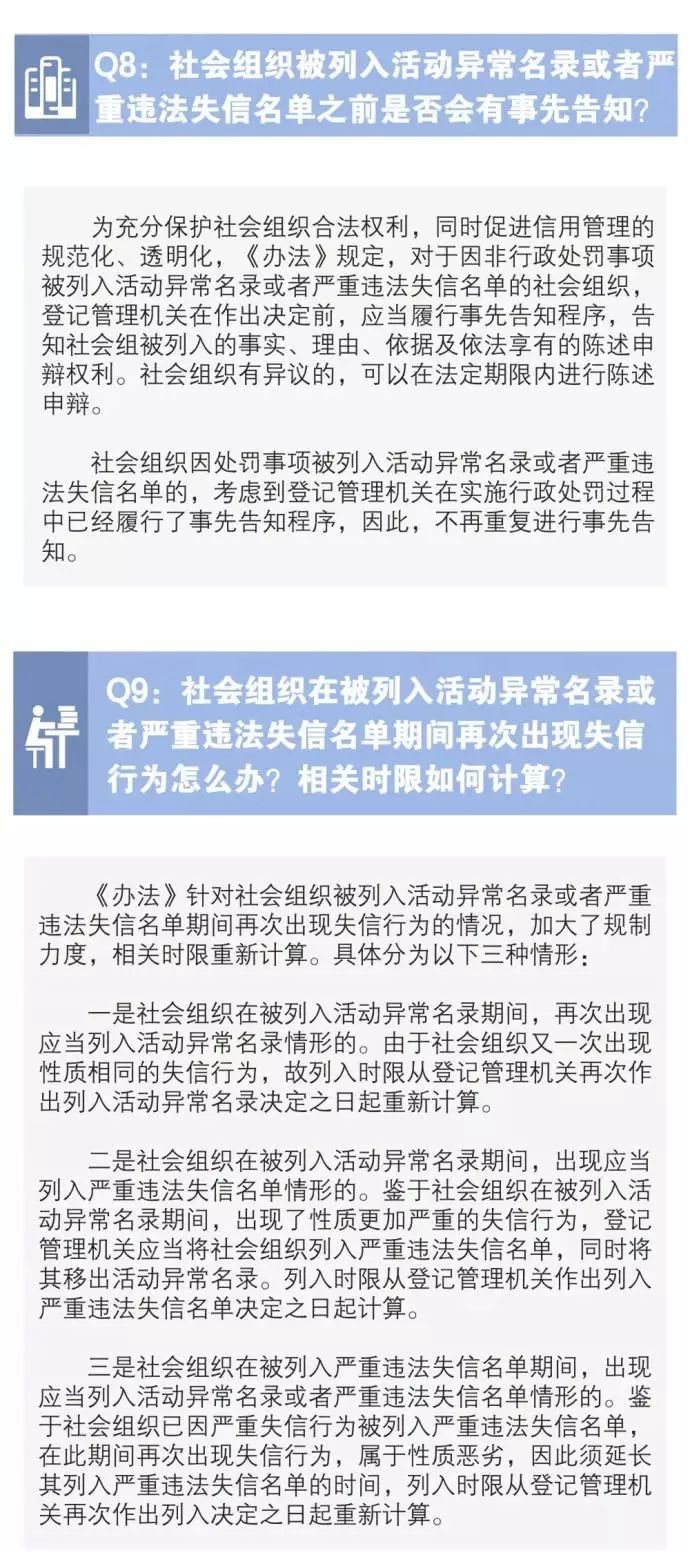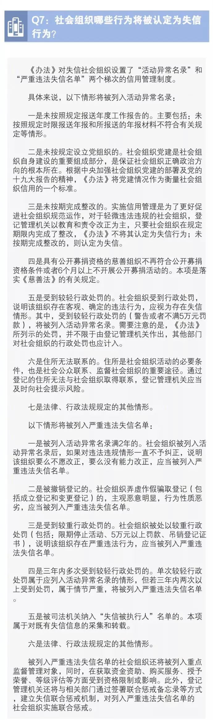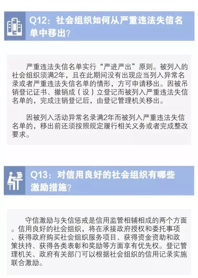 被列入嚴重違法失信名單的社會組織將被列入重點監督管理對象。同時,登記管理機關可對其采取不給予資金資助、不購買服務、不授予相關榮譽稱號等懲戒措施。
