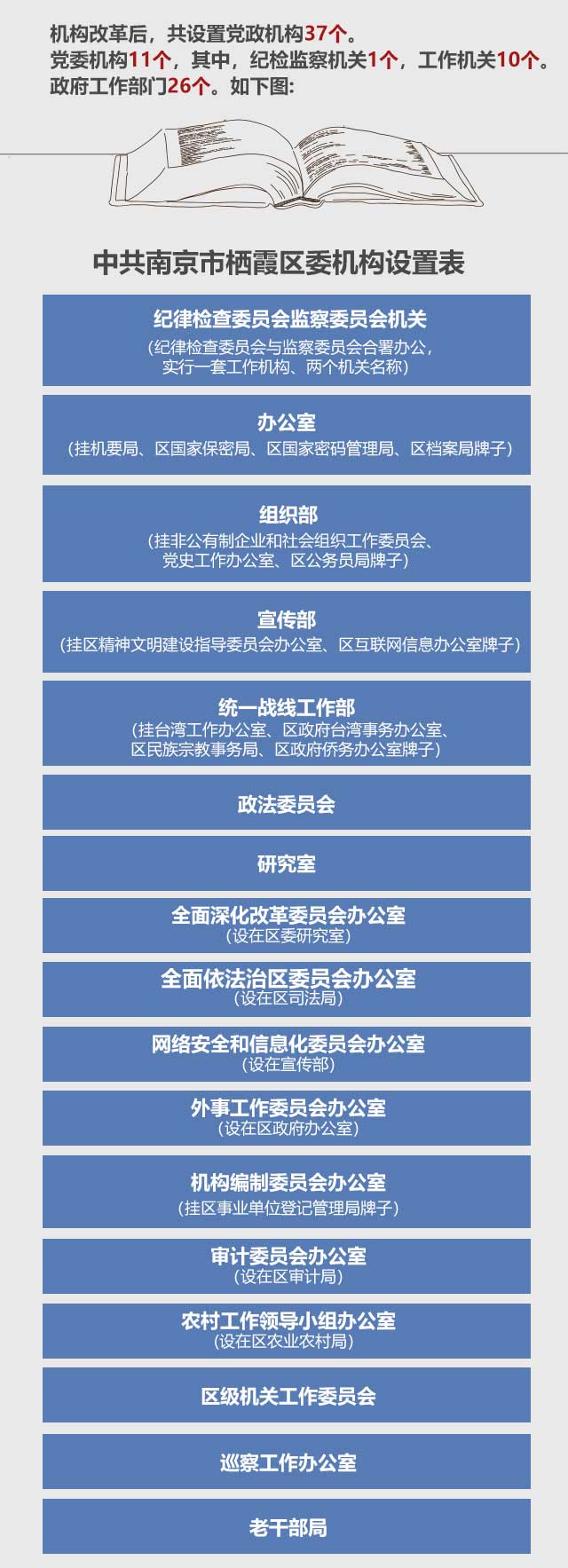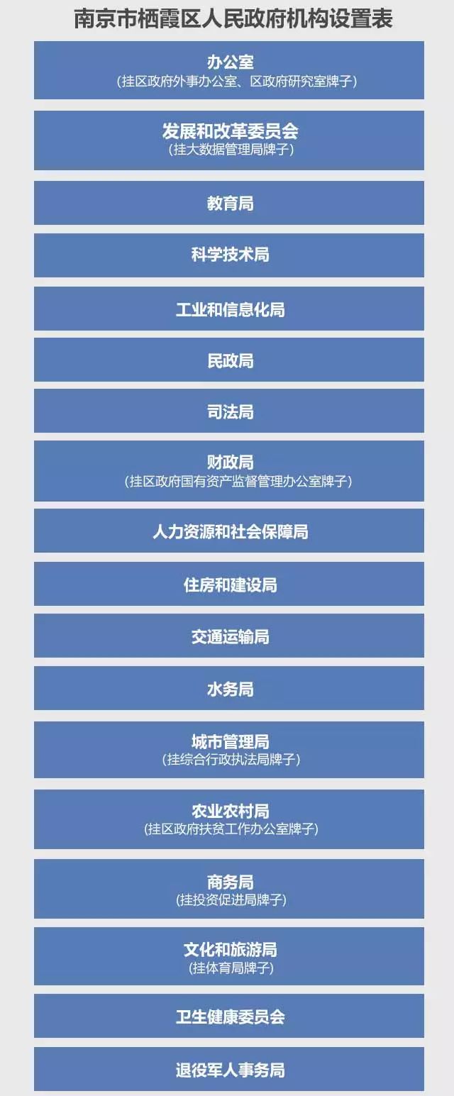 根據(jù)方案,棲霞區(qū)對(duì)應(yīng)中央、省級(jí)和市級(jí)機(jī)構(gòu)改革,調(diào)整優(yōu)化相應(yīng)機(jī)構(gòu)和職能。機(jī)構(gòu)改革后,共設(shè)置黨政機(jī)構(gòu)37個(gè)。黨委機(jī)構(gòu)11個(gè),其中,紀(jì)檢監(jiān)察機(jī)關(guān)1個(gè),工作機(jī)關(guān)10個(gè),政府工作部門26個(gè)。具體如下。