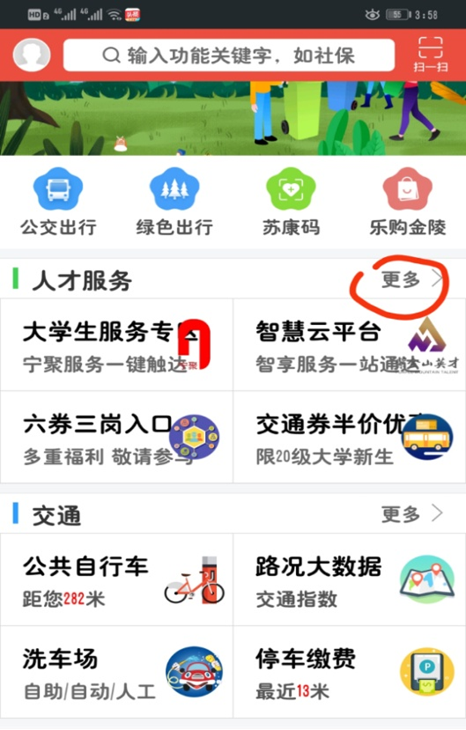一、打開(kāi)“我的南京”APP,找到人才服務(wù),點(diǎn)更多進(jìn)入。