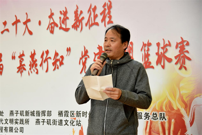 首屆“幕燕行知”黨建聯(lián)盟籃球賽開幕,主持人介紹此次活動經(jīng)過了一個多月的籌備組織,包括燕子磯及新城指揮部、中小學(xué)聯(lián)隊、高力集團(tuán)等8支隊伍參賽,此次活動是一個情感交流的平臺,讓轄區(qū)單位的中青年因為共同的熱愛籃球而在此結(jié)緣。