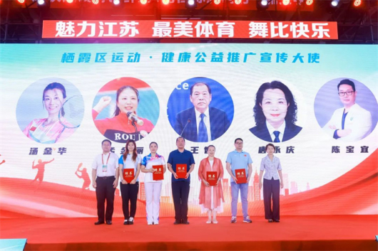 開幕式現場,聘任了5名棲霞區運動·健康公益推廣宣傳大使,分別是羽毛球世界冠軍湯金華,柔力球項目國家級裁判員、一級教練員孟金麗,江蘇省首批社會體育指導員摜蛋講師團成員王智,棲霞區瑜伽運動協會發起人、中國健身瑜伽國家級裁判員唐永慶,南京市康復醫學會理事、“教、衛、體實踐創新基地”行業實踐導師陳寶宜。他們將作為指導者和傳播者,幫助更多的人愛上體育運動,加入全民健身行列。