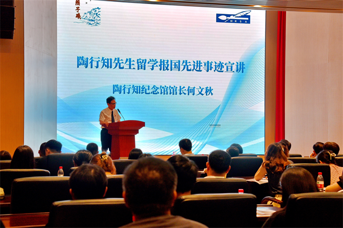 陶行知紀(jì)念館館長何文秋進(jìn)行留學(xué)報國專題宣講。1919年6月,陶行知等人于南京發(fā)起成立南京歐美同學(xué)會,并擔(dān)任會長,陶行知先生在燕子磯的曉莊村創(chuàng)建曉莊試驗鄉(xiāng)村師范學(xué)校,踐行“捧著一顆心來,不帶半根草去”的留學(xué)報國精神。何館長就新時代的留學(xué)生應(yīng)當(dāng)繼承前輩們?yōu)辄h留學(xué)、為國留學(xué)的精神力量,以愛國為底色,自覺地把個人的理想融入國家、民族的事業(yè)中,把個人的夢想同實現(xiàn)中華民族偉大復(fù)興的中國夢結(jié)合起來,書寫無愧于時代的青春之歌和人生華章進(jìn)行專題宣講。