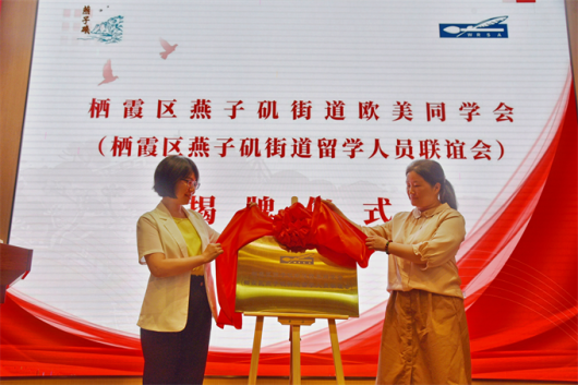 區(qū)委常委、統(tǒng)戰(zhàn)部部長章晶和南京市歐美同學(xué)會專職副秘書長凌美鳳共同為棲霞區(qū)燕子磯街道歐美同學(xué)會(棲霞區(qū)燕子磯街道留學(xué)人員聯(lián)誼會)揭牌。