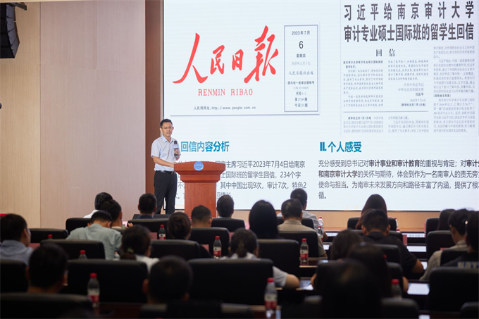 10:23南京審計大學人才工作辦公室副主任劉俊峰做人才工作經驗分享。劉主任分別從審大師資力量、審大的產學研基礎和長三角社會救助援助公共服務平臺使用三個方面進行了經驗分享。尤其講述了今年7月4日習近平總書記給審大審計專業碩士國際班的留學生回信對學校做好人才工作帶來的鼓勵和支持。