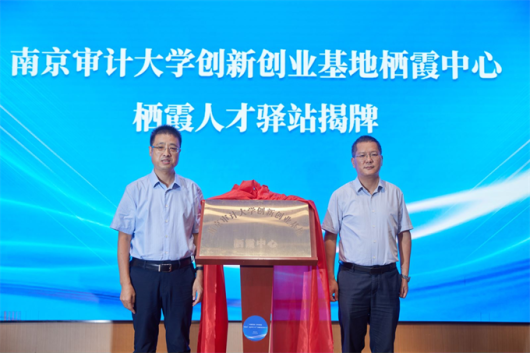 10:43南京審計大學黨委常委、副校長李乾文、棲霞區委常委、組織部部長陳世田為南京審計大學創新創業基地棲霞中心、棲霞人才驛站授牌