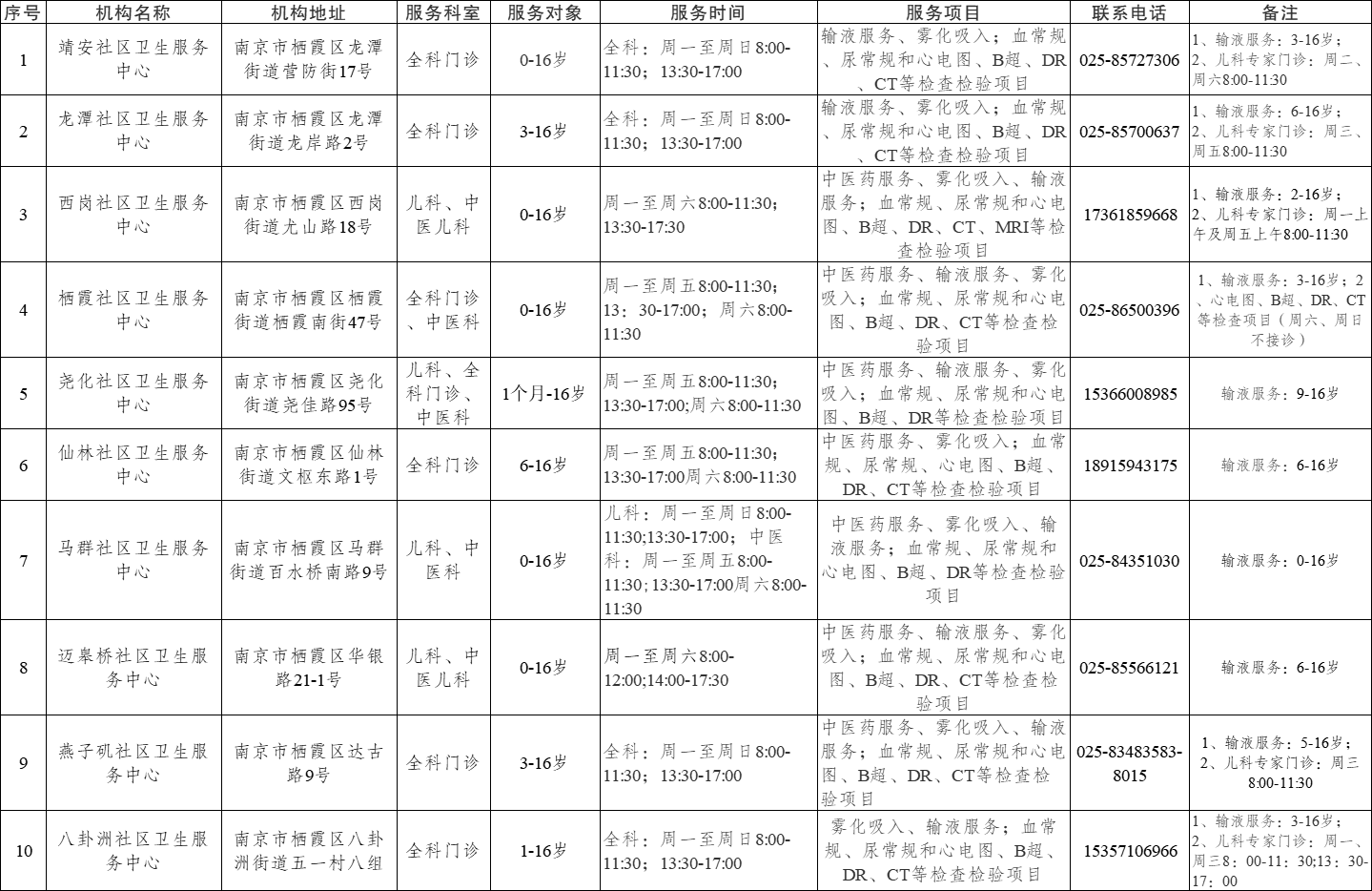 為方便家長為孩子尋求診療服務,現將棲霞區10家提供兒科診療服務的基層醫療衛生機構名單公示如下。這些機構分布在全區9個街道,服務時間多集中在每日8:00-17:30左右(各機構具體時段略有差異),可提供輸液、霧化吸入、血常規、B超、DR常見診療及檢查項目,部分機構還設有兒科專家門診和中醫兒科服務。