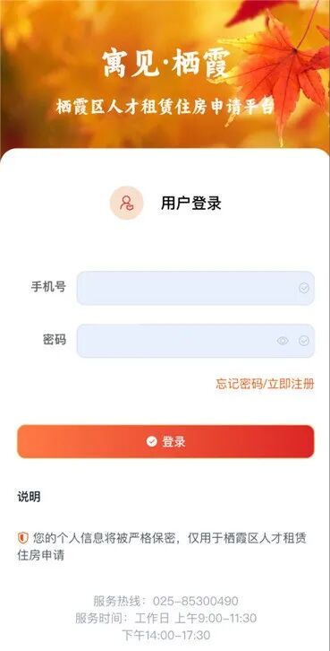 1. 申請人搜索并關注“棲霞區住房和建設局”公眾號,點擊“住房保障”,進入“人才租賃住房”小程序線上申請,申請人首次申請需注冊并登錄。
